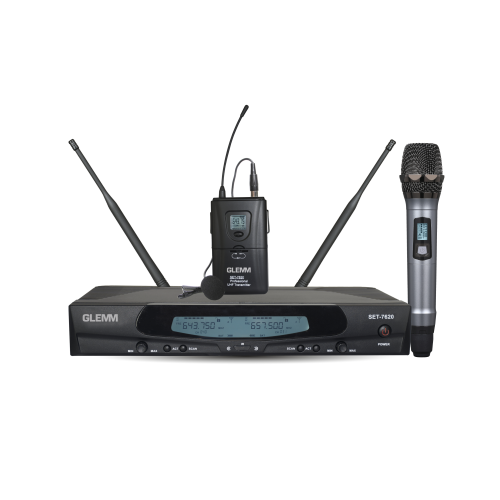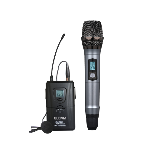 Professional UHF wireless microphone, including a receiver, a handheld transmitter and a lavalier transmitter. 100 channels available. The display on the receiver shows all operating information. Frequency pairing can be made in a few seconds, thanks to the infrared sensor. The wireless microphone operates in UHF band with special filters that eliminate interferences. The transmittters are also endowed with display, where you can view for example the charge status of the batteries (2 x 1,5V).