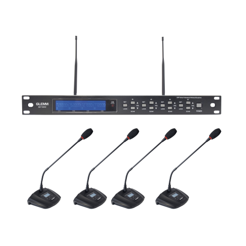 Excellent for all the situations where it is difficult or inconvenient to wire an audio conference system. The package includes a receiving base and 4 desk wireless microphones with transmission button and light ring. The system can operate within a range of 50m from the receiving base. The base can be connected to mixers or amplifiers through the connectors on the back. It is available in 3 versions, for every kind of necessity. It is possible to use up to 4 systems simultaneously, for a total of 16 microphones. It operates in multifrequency mode. The frequency ranges available on the 4 channels are: 1) 640.00 - 664.750 Mhz 2) 665,00 - 689.750 Mhz 3) 640.00 - 664.750 Mhz 4) 665.00 - 689.750 Mhz