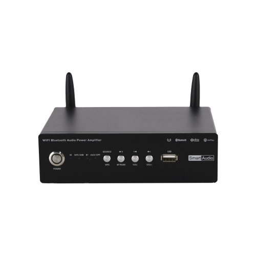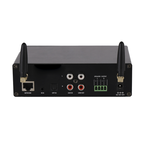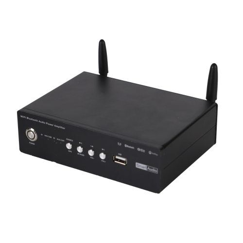 Piccolo apparecchio in grado di amplificare 2 diffusori da 60W a 8 Ohm. E' possibile collegare un supporto di memoria USB per riprodurne le tracce Mp3. Ma la sua particolarità è il fatto di potersi connettere alla rete internet per essere poi controllato dalla sua applicazione gratuita. L'applicazione gestisce numerosi software musicali quali ad esempio spotify. Collegando sulla stessa rete più amplificatori potrete ottenere un vero impianto audio multiroom.