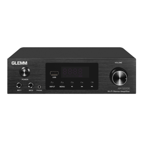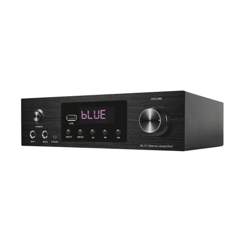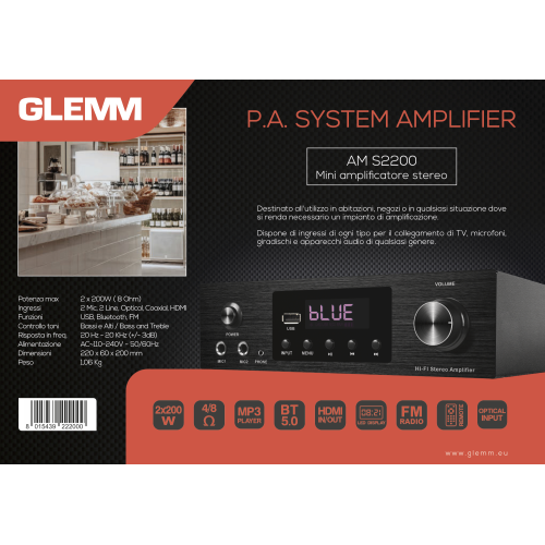 Amplificatore stereofonico dalle ridotte dimensioni ma in grado di fornire prestazioni straordinarie. Opera a 4-8 Ohm e sul pannello frontale possiede 2 ingressi microfonici e una presa 3,5mm per smartphone. Sul retro sono presenti prese RCA per 2 ingressi di linea, presa ottica, coassiale e persino una presa HDMI in entrata e uscita con gestione del sistema ARC. E' possibile collegare un subwoofer attivo alla presa posteriore RCA. Dispone di radio, lettore Mp3, ricevitore bluetooth e telecomando per il controllo a distanza. La presa USB è in grado di leggere anche formati lossless quali WMA, Mp3, FLAC e API. Ideale per l'utilizzo in abitazioni, uffici, attività commerciali, etc.