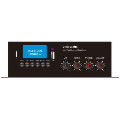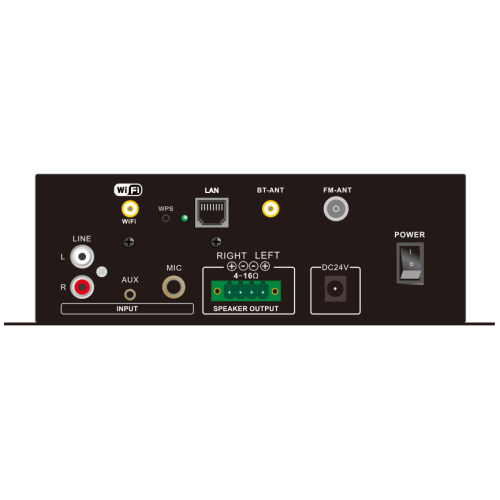Amplificatore stereo multiroom 2 x 50W con ricevitore DAB+ e collegamento tramite LAN o wifi. Gestisce 2 diffusori a 4 o 8 ohm, dispone di ingresso di linea tramite RCA o jack 3,5mm e di ingresso microfonico standard 6,3mm. Il modulo multimediale è in grado di leggere brani da chiavette USB o schede microSD ma anche di gestire collegamenti bluetooth. Non manca la radio sia FM che DAB+ E' alimentato a 24V (adatto quindi anche all'utilizzo su camion o pullman) e offre la possibilità di gestire audio proveniente da internet grazie al suo collegamento tramite wifi o retelan. E' compatibile DLNA e con l'applicazione gratuita LEGACY disponibile per android e IOS.