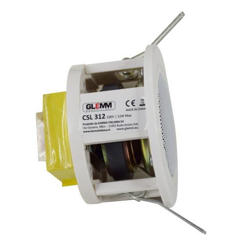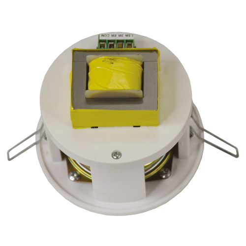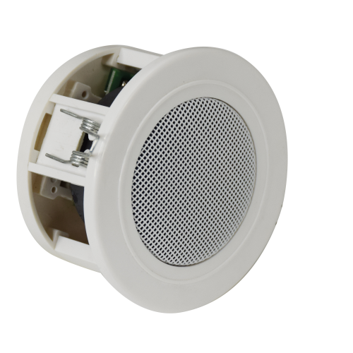 Piccolo diffusore da incasso per la riproduzione di audio in ottima qualità. Monta un sofisticato woofer da 3" con un trasformatore per il funzionamento a 100V. Applicabile facilmente a controsoffitti con un foro di soli 9cm. E' possibile selezionare una potenza max di 3,6 o 12W.