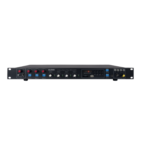 Mixer a 4 zone gestisce 3 ingressi tramite XLR o Jack 6,3mm per il collegamento di segnali microfonici o di linea e 1 ingresso RCA. L'ingresso microfonico 1 dispone di funzione priority. E' presente un modulo MP3 per la riproduzione di brani da SD/USB attivabile con l'inserimento della chiavetta. Inoltre è presente il ricevitore radio FM che si attiva all'accensione. Inseribile a rack con ingombro 1U Unico nel suo genere, dispone di 4 uscite indipendenti alle quali inviare a matrice i segnali in ingresso. Possibilità di monitorare in cuffia i vari ingressi. Supporta alimentazione phantom.