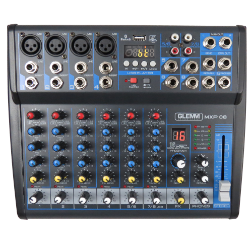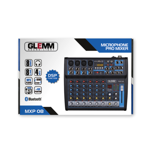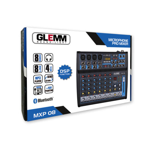 Mixer microfonico 8 canali destinato ad uso professionale. Grazie alle numerose funzioni di cui dispone offre il collegamento di 4 microfoni bilanciati e fino a 8 segnali di linea. Ogni canale dispone di regolazione indipendente di tonalità. Un sofisticato DSP offre 16 effetti di riverbero preimpostati. Il modulo MP3 è in grado di riprodurre brani contenuti su chiavette. La stessa presa USB può essere utilizzata per il collegamento a computer per inviare o ricevere segnali audio (cavo incluso). Dispone persino di ricevitore bluetooth.