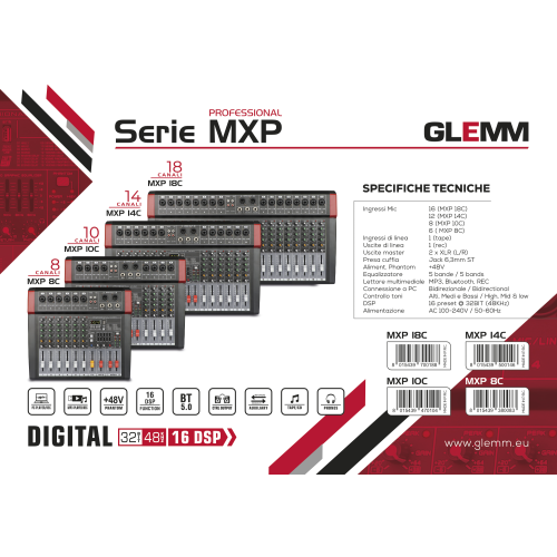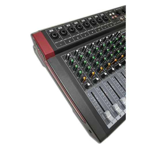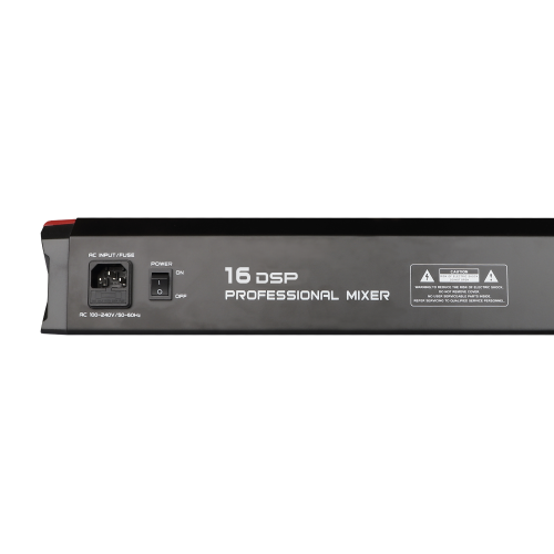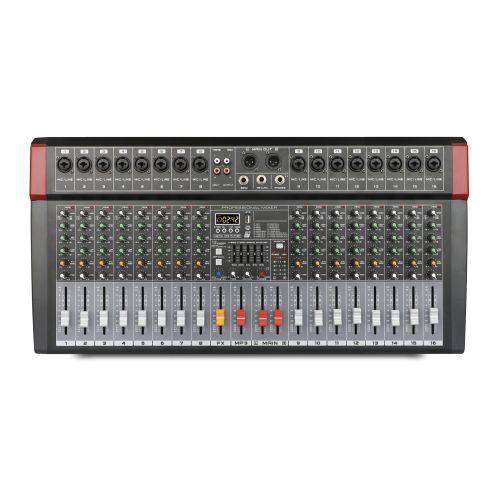 Alimentato a 110/220V e ideato per essere appoggiato, questo mixer audio consente il collegamento di ben 16 segnali mono (sia di linea che microfonici) e un segnale di linea stereofonico. I 16 canali sono gestiti da connettori XLR/6,3mm e ogni canale possiede numerose regolazioni per guadagno, tonalità, incidenza effetto e bilanciamento canale. Nel caso di collegamento microfoni a condensatore, è possibile attivare l'alimentazione phantom. Un sofisticato modulo multimediale è in grado di leggere brani da chiavette USB o tramite bluetooth. E' possibile registrare su porta USB ma anche collegare il mixer al PC sempre tramite tale porta per poter scambiare audio tra i due device. Il circuito DSP, con campionamento a 32bit, gestisce effetti abbinabili ai canali. Completa il mixer un equalizzatore grafico a 5 bande.